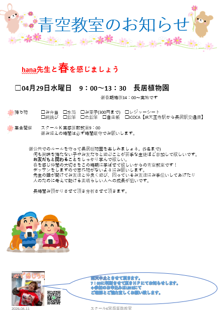 青空教室として、四季を通して仲間と沢山体験へ出かけます。言葉の大切さやルールの大切を仲間と共に深く実体験から学びます。(課外活動は参加自由です)